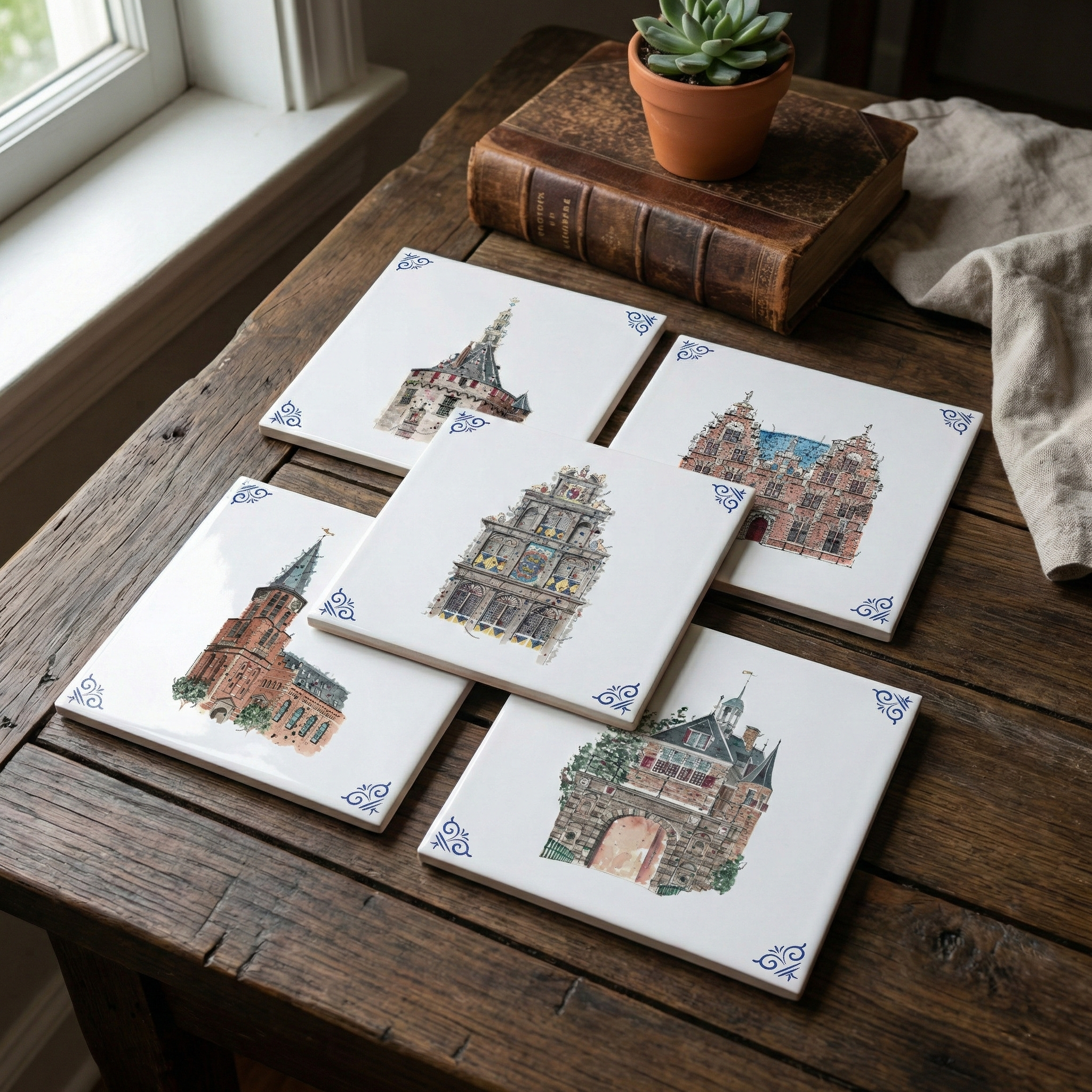 Deze aquarelserie legt het karakter van historische en bijzondere gebouwen vast met aquarel, speelse inktlijnen en verfspatten.